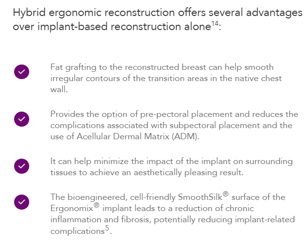 Hybrid ergonomic reconstruction is the concept of combining autologous tissue with Motiva® Implants, offering patients the option of a natural-looking result14.